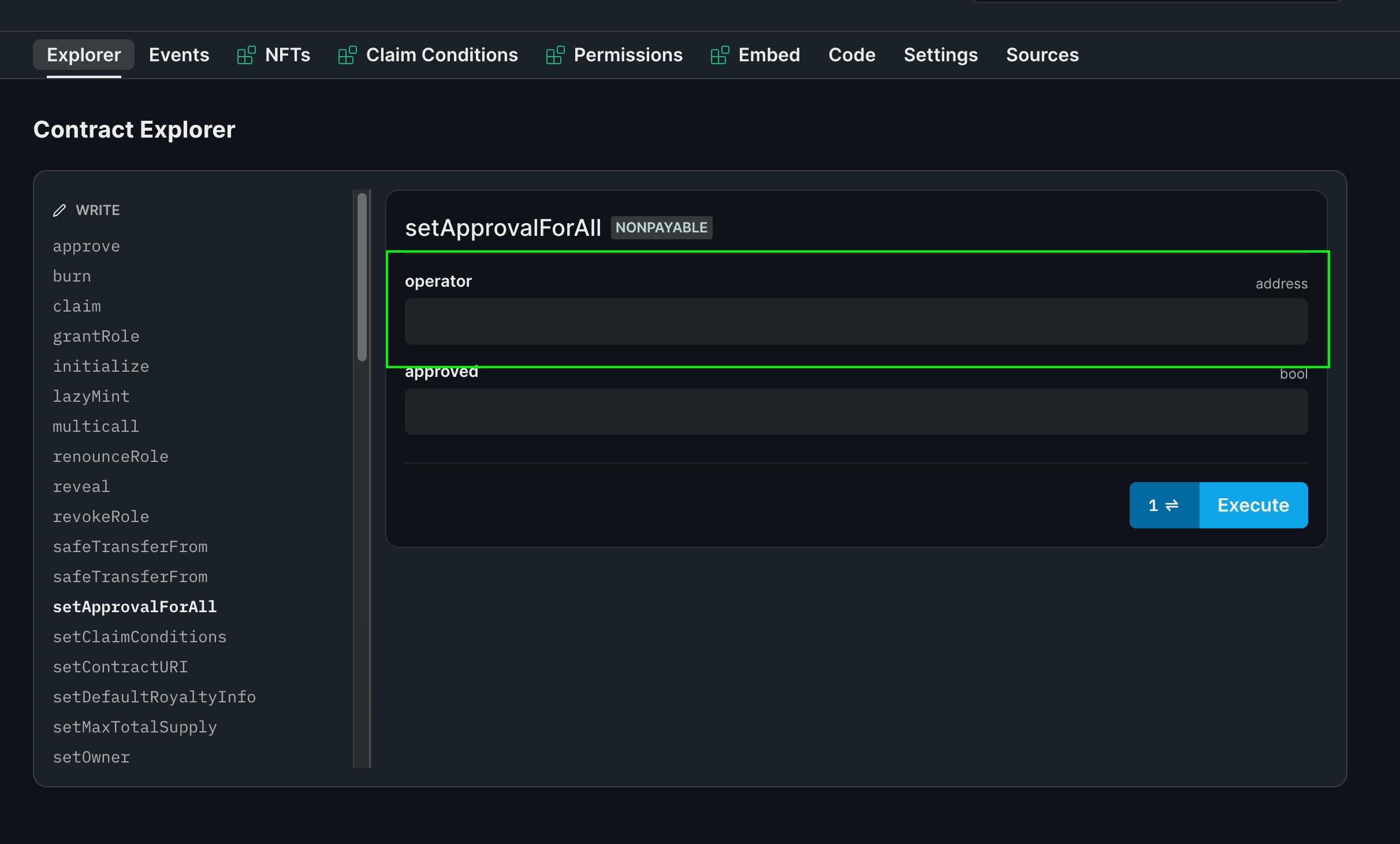 • Approve the airdrop contract in your NFT contract via approve or setApprovalForAll. We recommend setApprovalForAll for large airdrops so you don’t need to approve each token ID individually.